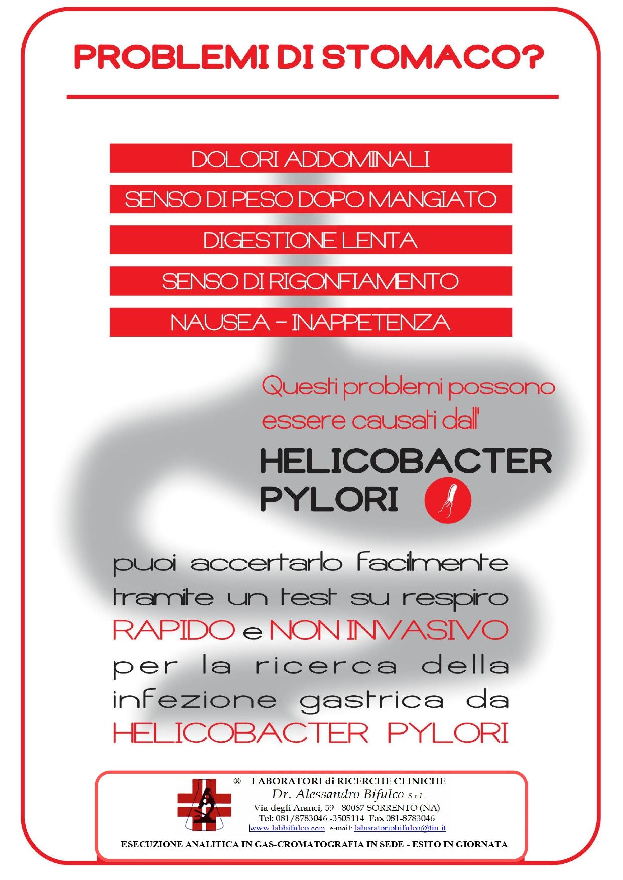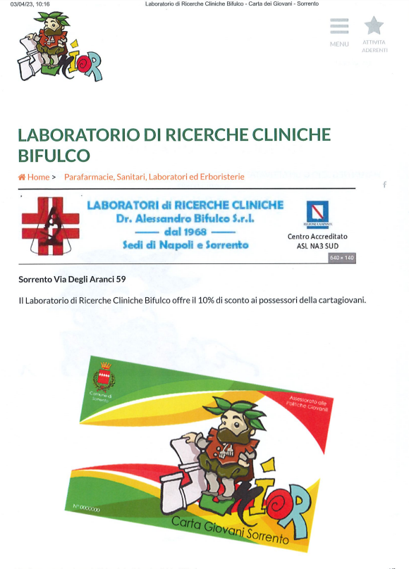 Il Laboratorio di Ricerche Cliniche del Dottor Alessandro Bifulco rappresenta un centro di eccellenza nel campo delle analisi cliniche a Sorrento ed è una struttura sanitaria accreditata con SSN Servizio Sanitario Nazionale, Cassa Marittima e Internazionale, ESA Enterprise Shipping Agency, Banca Intesa, Previmedical, Fasdac, Ministero della Salute etc.