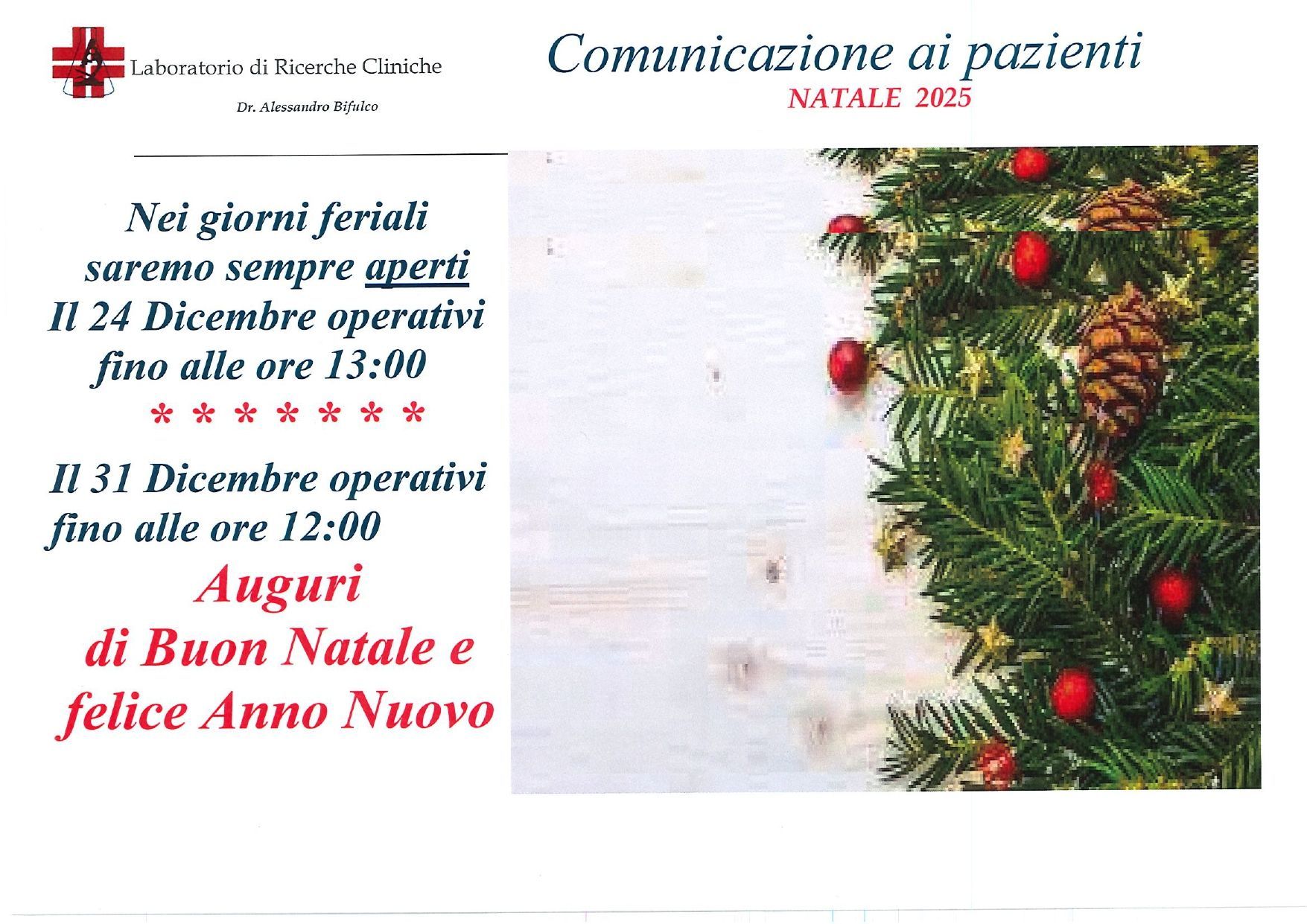 Il laboratorio, per tutto il periodo di agosto, sarà sempre aperto tranne i giorni festivi. Gli orari delle prestazioni, pertanto, non subiranno alcuna modifica.