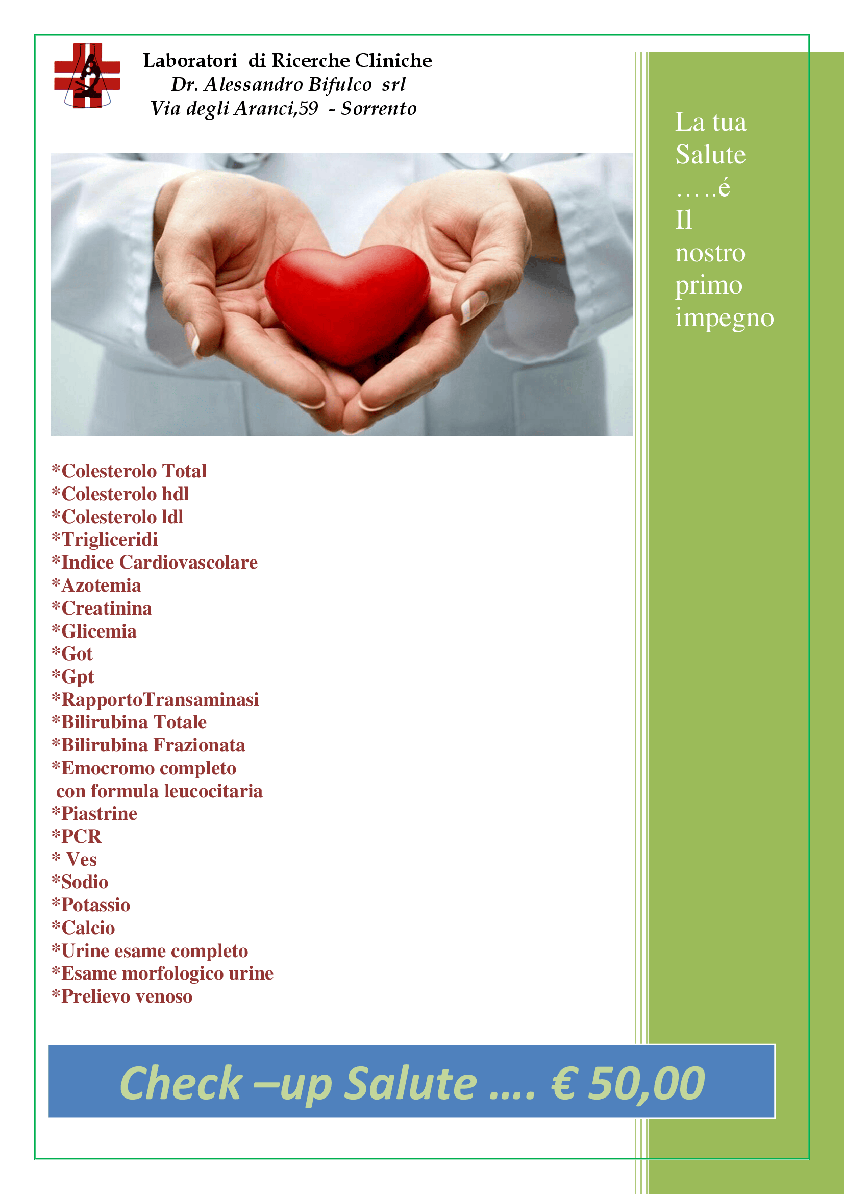 Nei laboratori di analisi cliniche a Sorrento del dottor Bifulco si eseguono le seguenti prestazioni con consegna in giornata dei seguenti esami diagnostici: